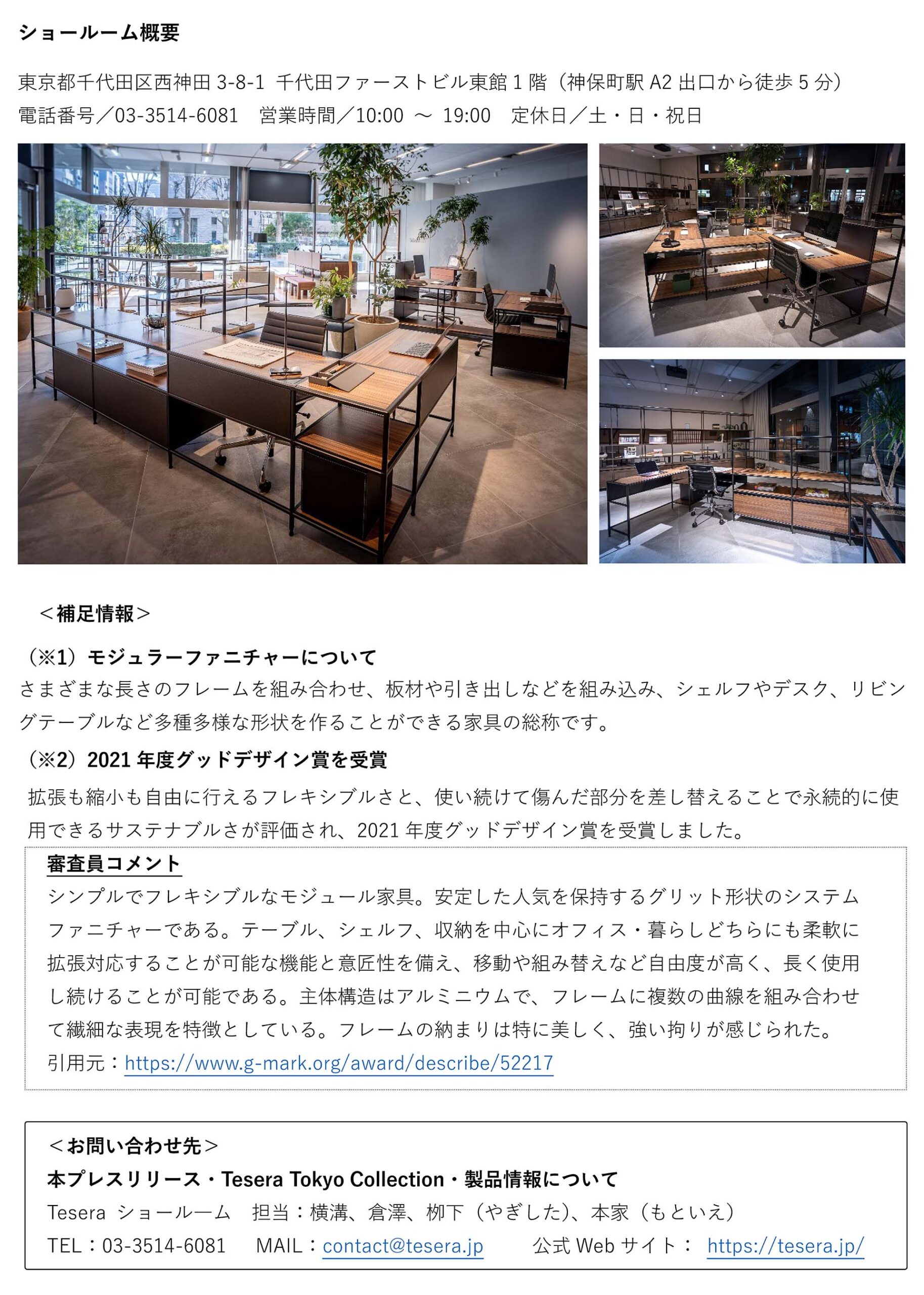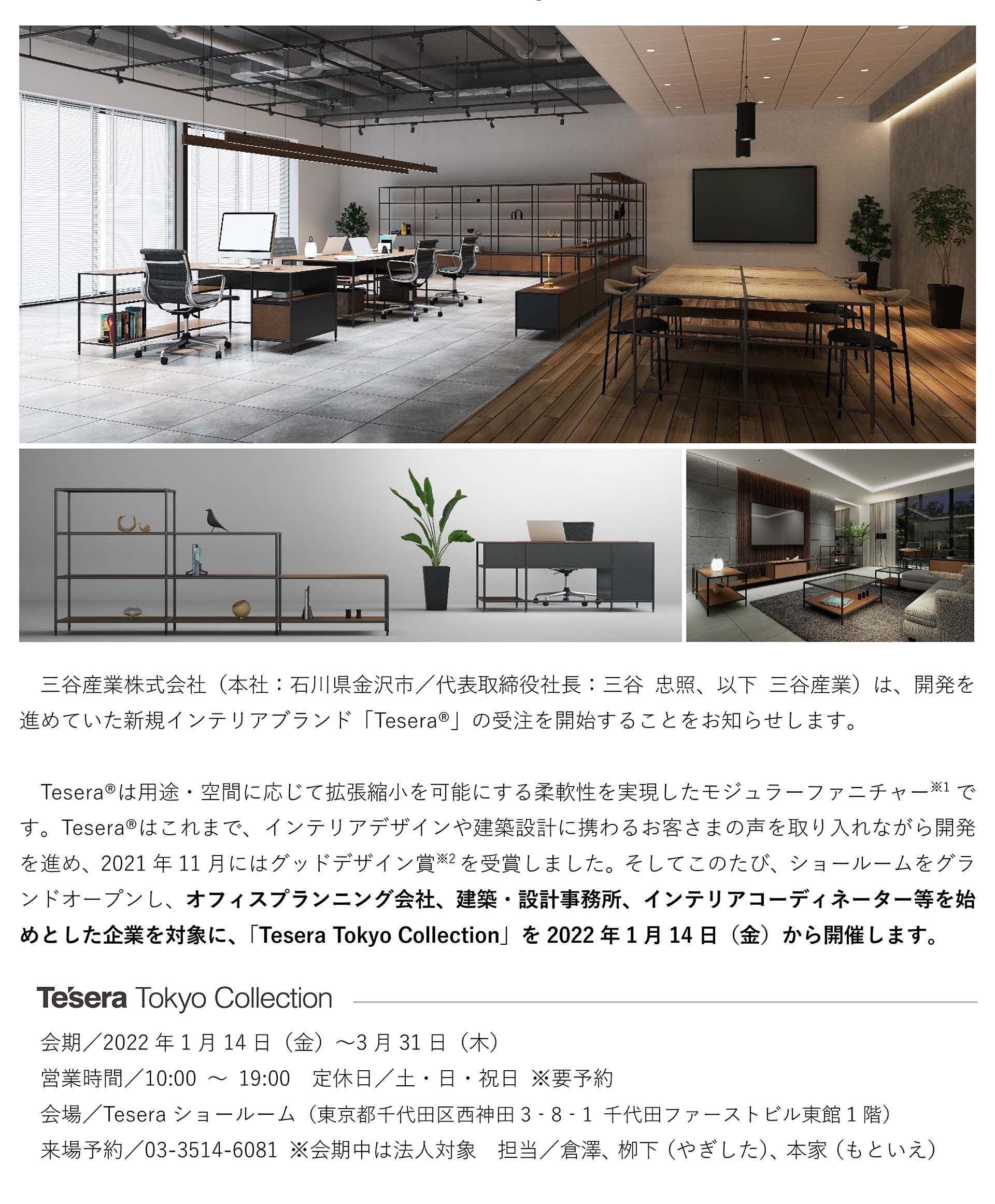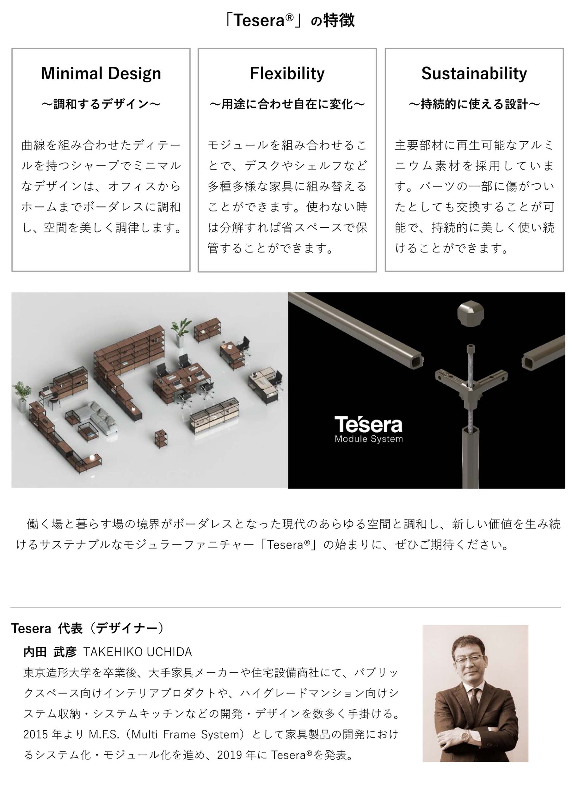 2022.01.13 プレスリリース サステナブルモジュラーファニチャー「Tesera®」の受注開始 ~1月14日からTesera Tokyo Collectionを開催~ サステナブルモジュラーファニチャー「Tesera®」の受注開始 ~1月14日からTesera Tokyo Collectionを開催~ 【PDF ファイルダウンロード】 一覧をみる