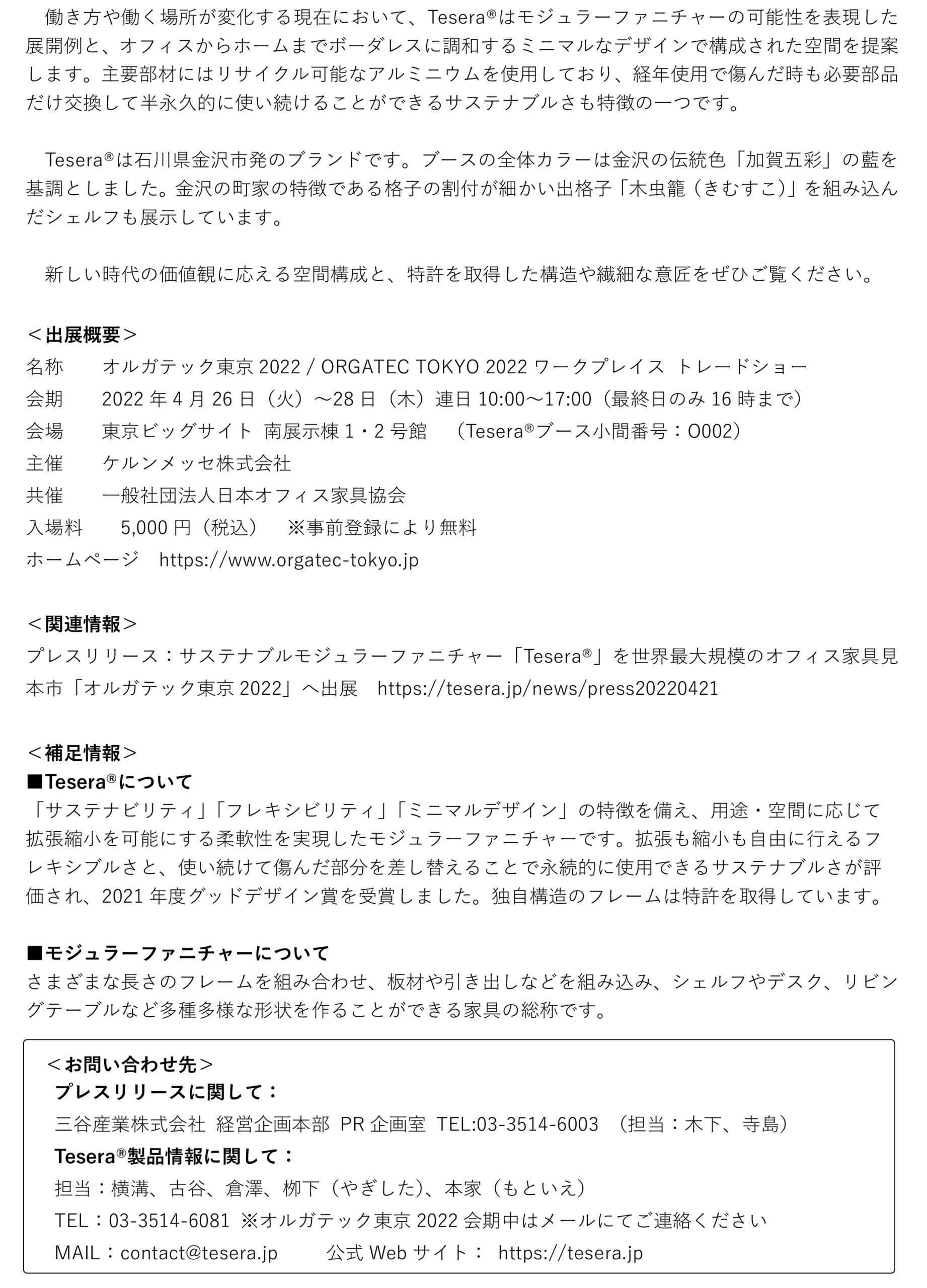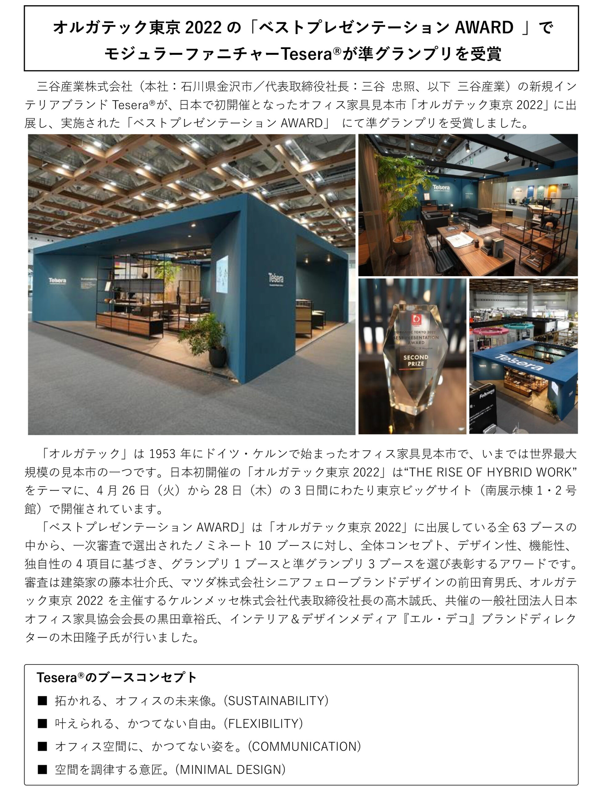 3. オルガテック東京2022 の「ベストプレゼンテーションAWARD 」で モジュラーファニチャーTesera®が準グランプリを受賞